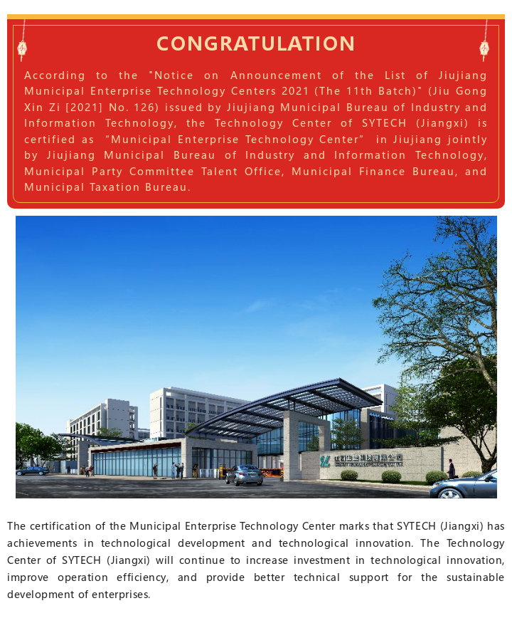 SYTECH (Jiangxi) Passed the Certification of Municipal Enterprise Technology Center in Jiujiang